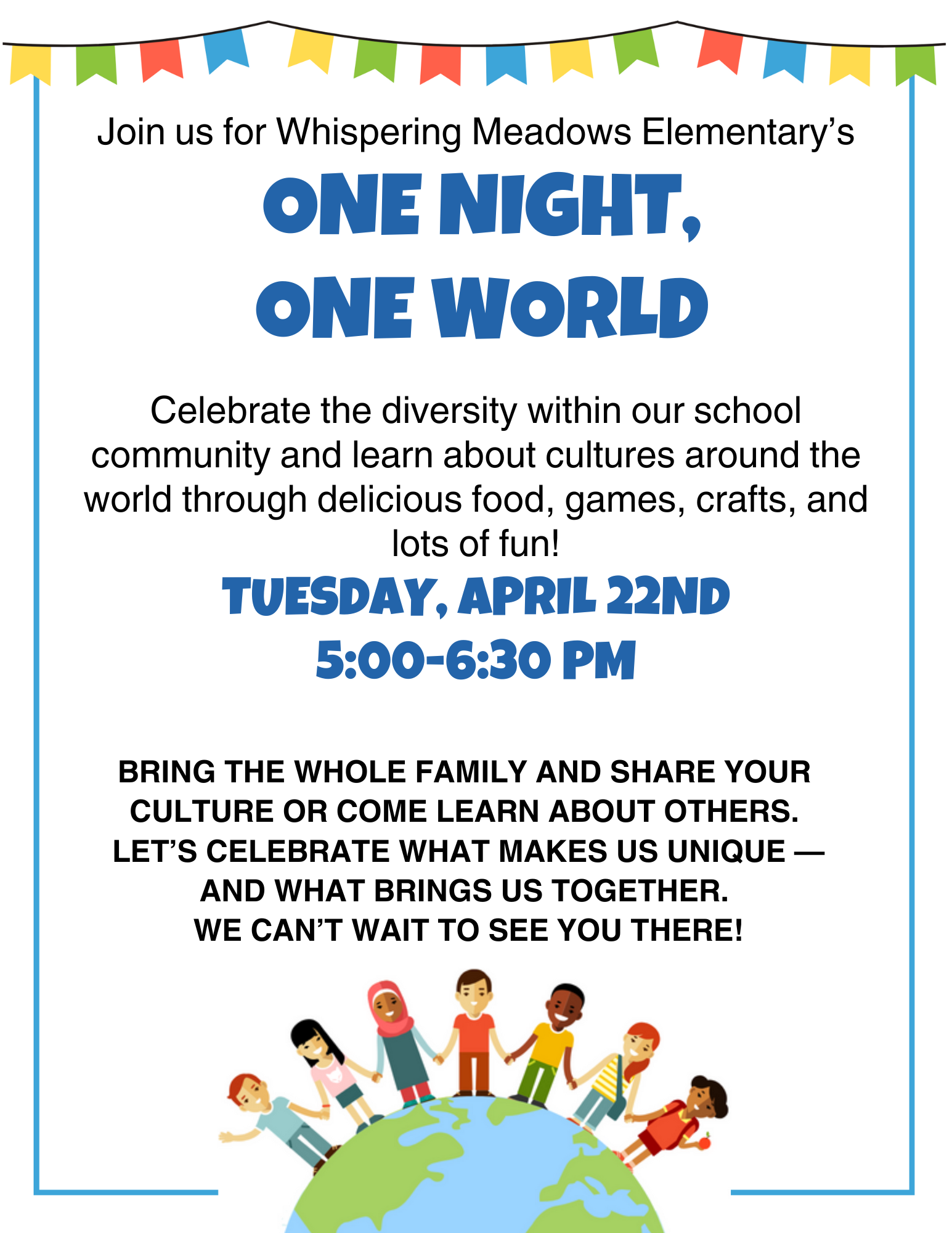 We are thrilled to invite all of our Maverick families to join us for our One Night, One World Showcase on Tuesday, April 22nd from 5:00-6:30 PM! This will be a wonderful opportunity to celebrate the diversity and talents of our students and community.